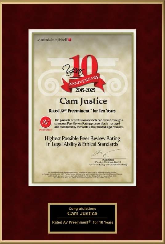 Cam Justice earned the designation of Premier 100 Trial Attorney from the National Association of Jurisprudence, an invitation-only professional organization whose stringent criteria and standards recognize commitment to serving clients. Cam’s page is here and includes testimonials from clients and from members of the legal profession.